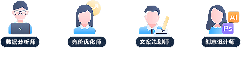 競(jìng)價(jià)優(yōu)化師和文案策劃師,實(shí)時(shí) 分析投放人群興趣點(diǎn)的變化,結(jié) 合業(yè)務(wù)優(yōu)勢(shì),策劃全新的廣告創(chuàng) 意、圖片及競(jìng)價(jià)頁(yè)面